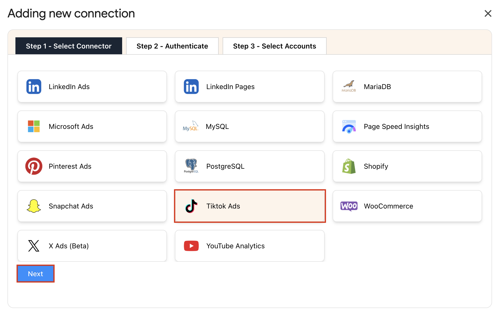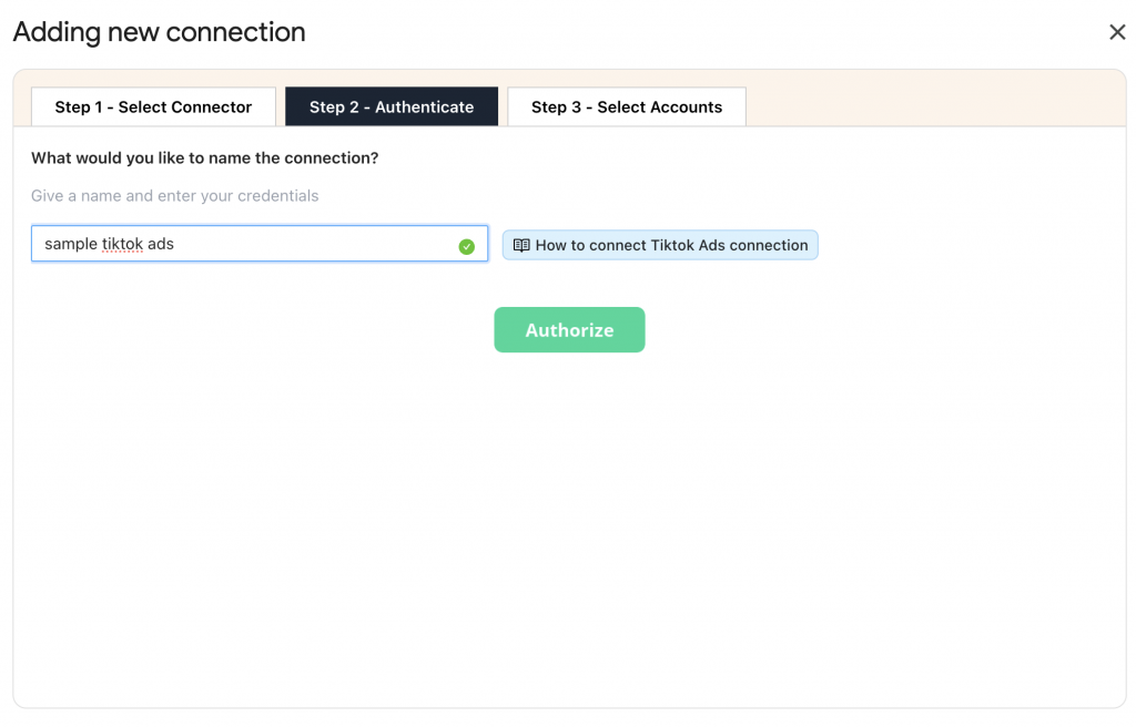 Select the TikTok Ads connector from the list of options. Next, authorize the Connection by specifying your login credentials.