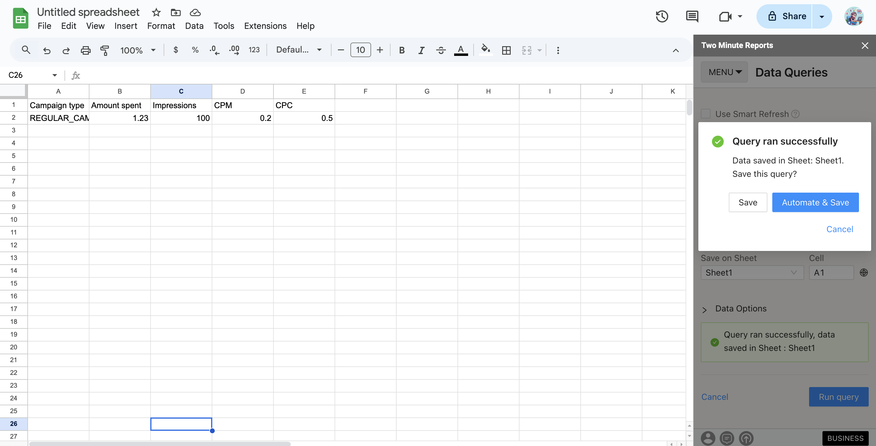 Pro TMR Tip: Run all your queries directly from the Extensions menu on your Google Sheets. Go to Extensions > Two Minute Reports > choose your desired quick action.