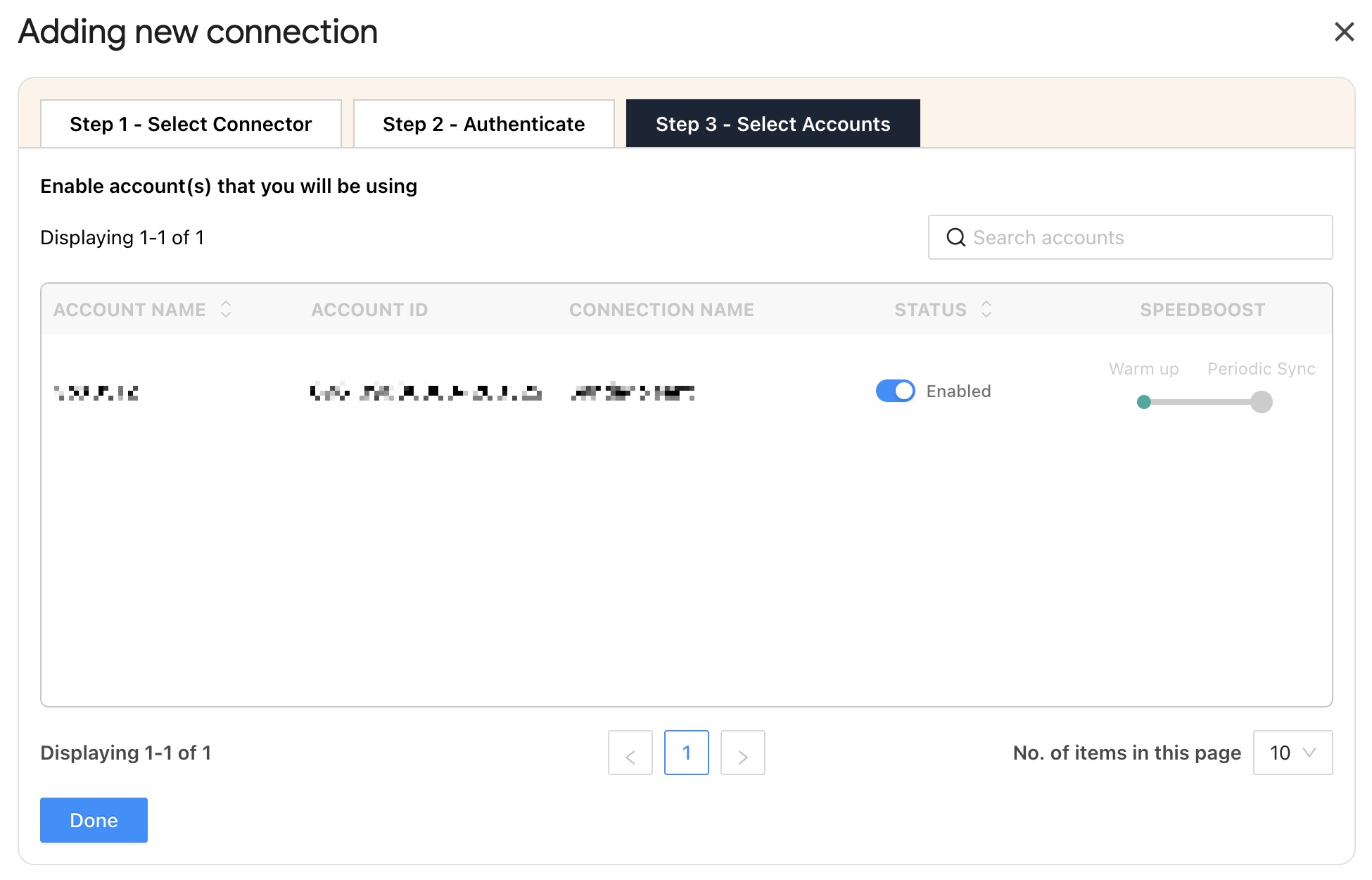 Enable the accounts for which you want to run queries. Once enabled, Speedboost is automatically activated, allowing you to retrieve your TikTok Ads data within seconds. Please note that you cannot run queries from disabled accounts.