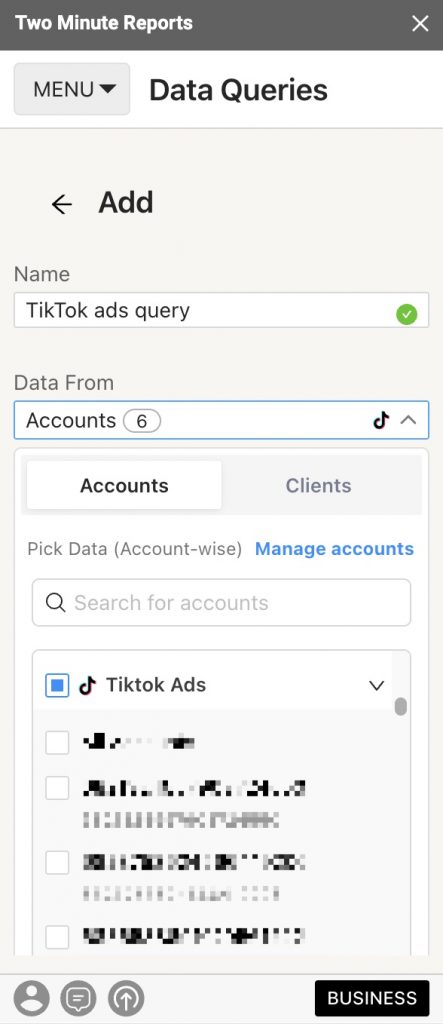 Click Add and choose the respective TikTok Ads accounts to analyze campaign performance. You can manage “n” number of clients’ TikTok Ads accounts under one roof. Simply select one or more accounts to analyze campaign performance.