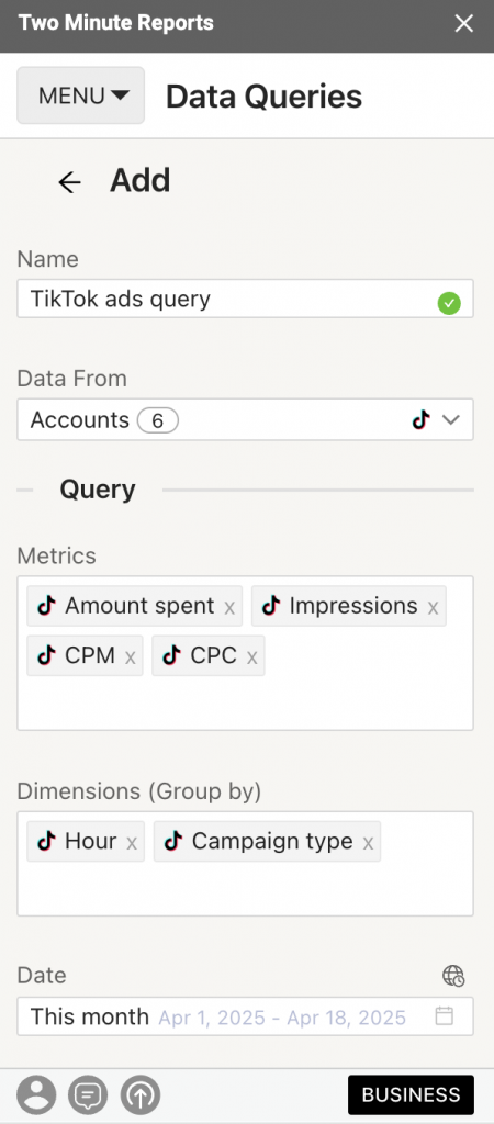 Once done, you can connect your TikTok Ads account with Two Minute Reports to access your campaign performance insights.