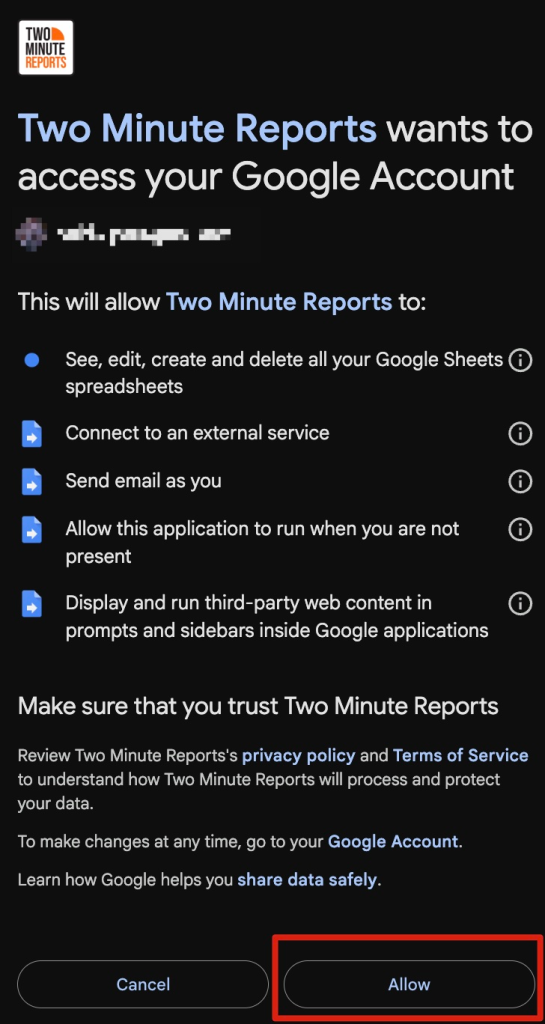Review the required permissions for Two Minute Reports. After accepting the terms and conditions, click Allow to grant access so the add-on can manage and work with your data.