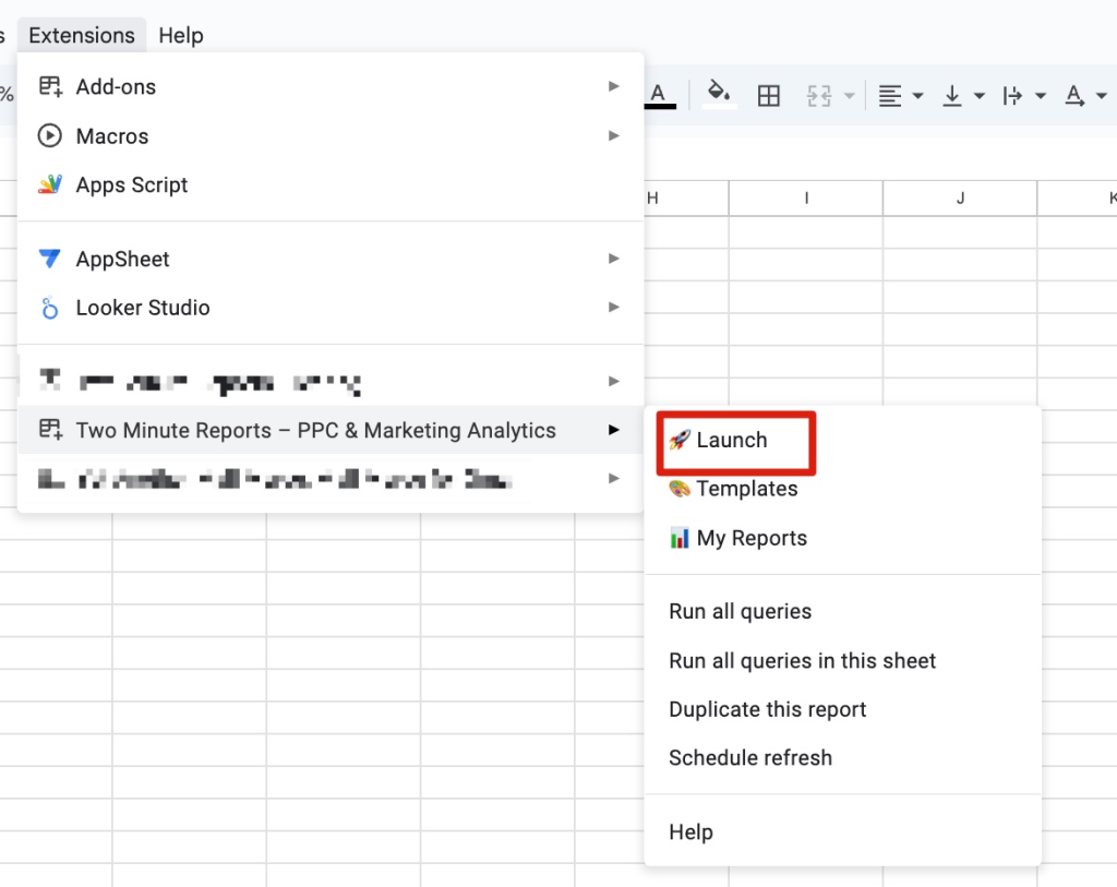 Next, open Google Sheets, then go to Extensions > Two Minute Reports > Launch to start the add-on.
