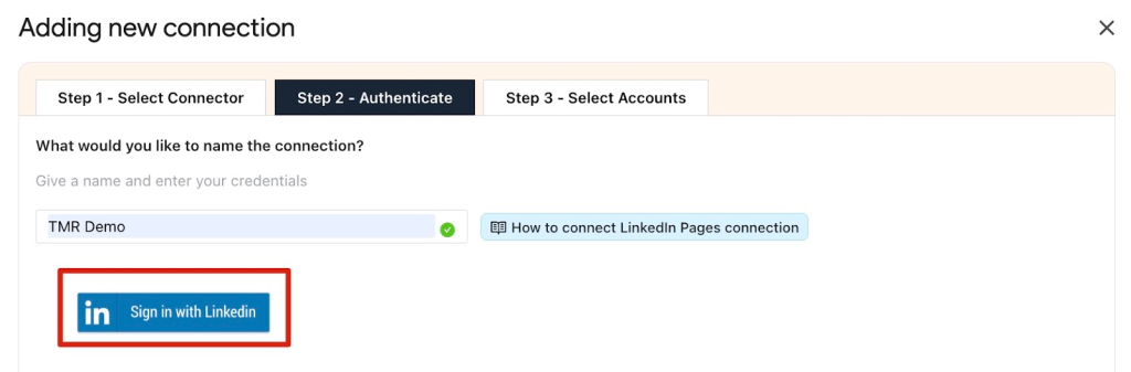 Enter a name for your connection and click Sign in with LinkedIn. After connecting your LinkedIn account, click Yes to authenticate the login.