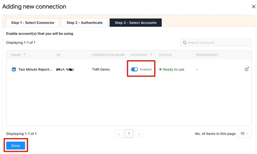 In the Select Accounts section, enable the account IDs you want to pull insights from and click Done.
