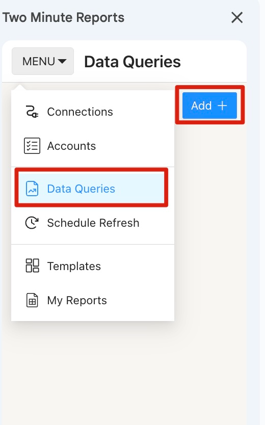 Once the Two Minute Reports sidebar opens, you can start creating connections and run queries.