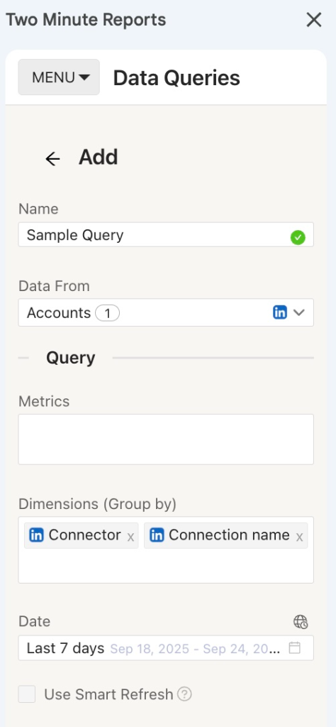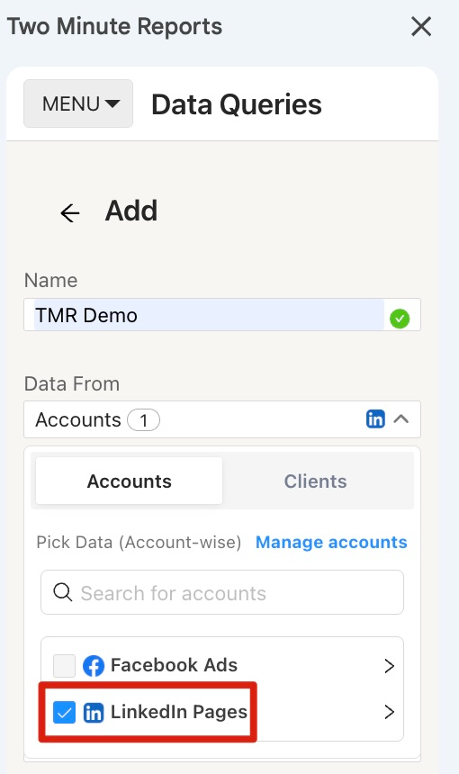 To pull data from your LinkedIn Pages, go to the Data Queries section and create a new query.