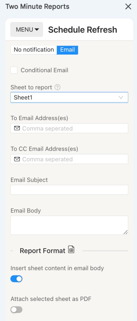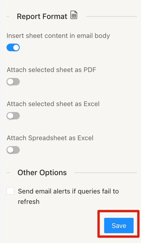 You can also specify the reporting format. Options include inserting the sheet content directly into the email body, attaching the selected sheet as a PDF or Excel file, or attaching the entire spreadsheet as an Excel file.