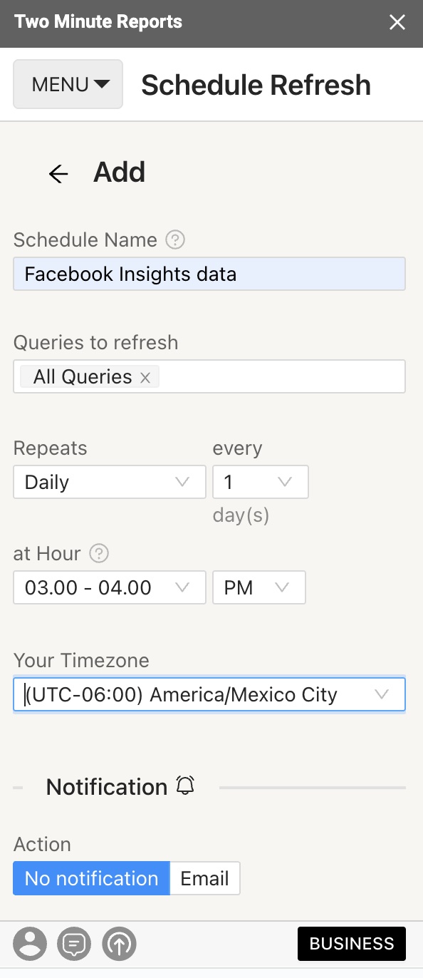 - At Hour is the exact time when the refresh will occur. You can select to schedule the data refresh on a PM or AM.