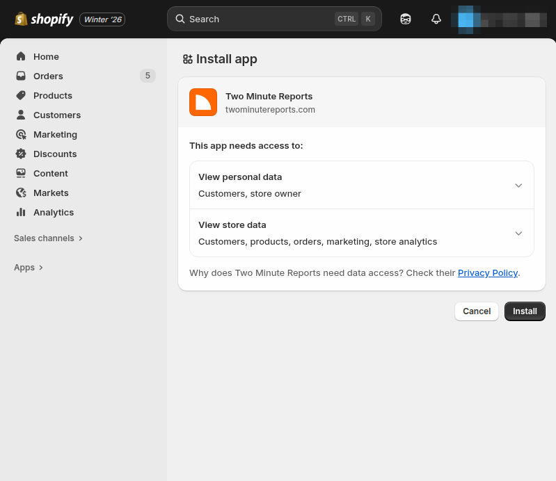 - Once you have filled in the required details, click Save. A new window will open asking you to authorize and install the Two Minute Reports. Review the requested permissions and click Install to continue. After the authorization is complete, you can safely close the window.