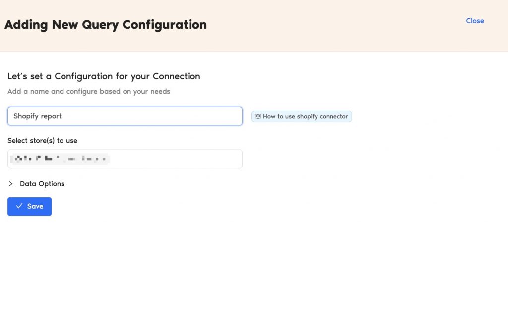 - The Adding New Query Configuration dialog box appears. Name the query config, select (from the list of enabled) store accounts from the dropdown, and configure your Shopify store report. Once done, click Save.