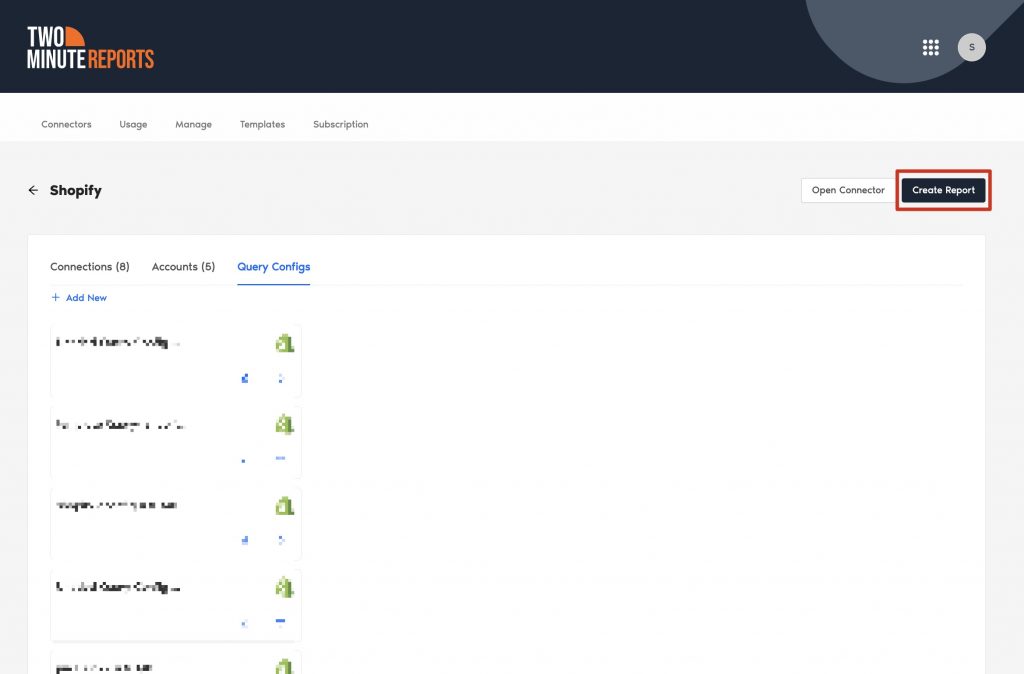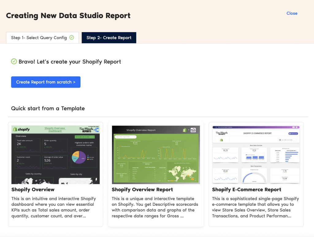 Select the Query Config that you’ve created (in our case, “Shopify report”) from the list of options. Click Next and choose ‘Create report from scratch’ to open the Looker Studio dashboard.