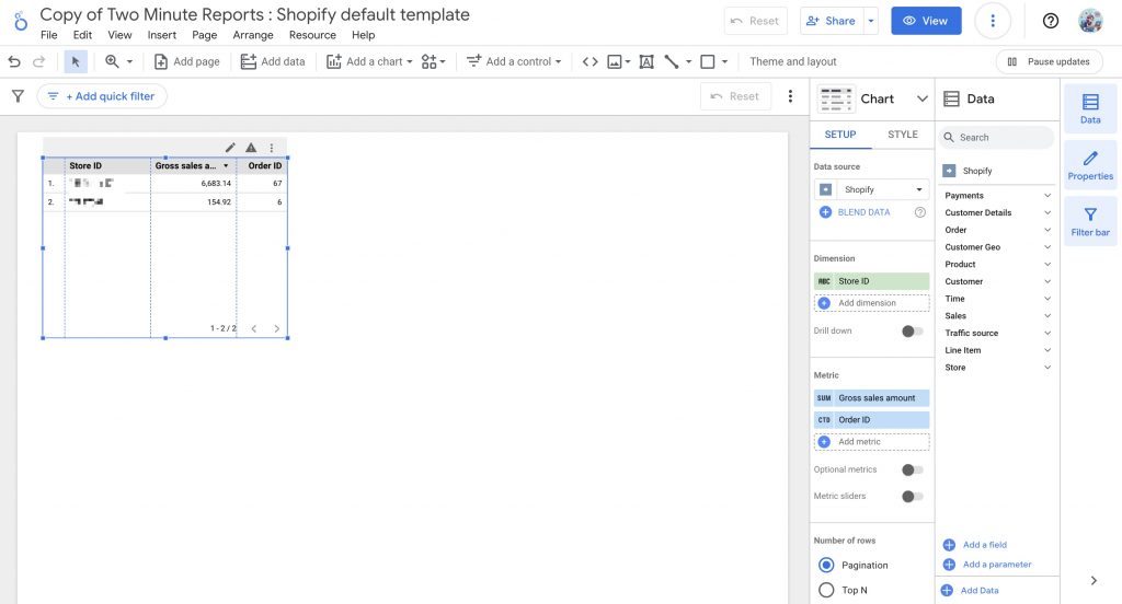 - Once you click Create Report, you’ll be directed to the Looker Studio dashboard. Here, you can drag and drop the associated Shopify metrics and dimensions to analyze store performance insights faster.