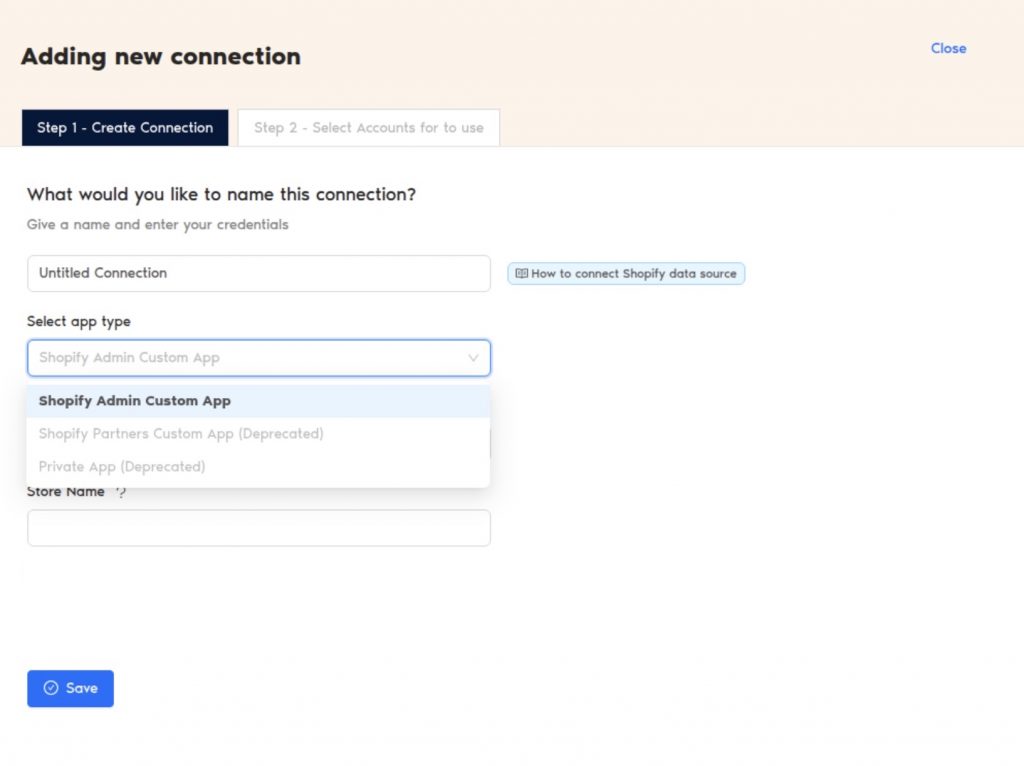 Enter your Connection name and choose the app type as Shopify Admin Custom App. Paste the API admin access token in the Access token field. Lastly, specify your shop name.