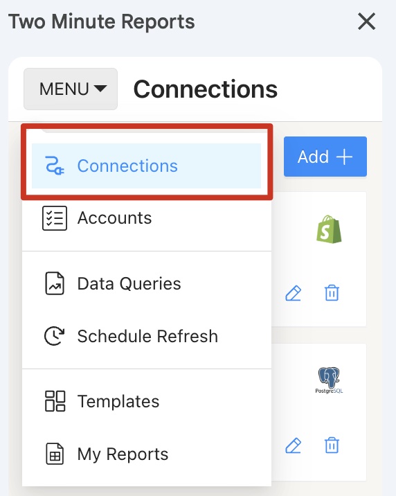 Click Menu at the top left of the sidebar to navigate to the Connections section. Next, click Add to create a new Connection.
