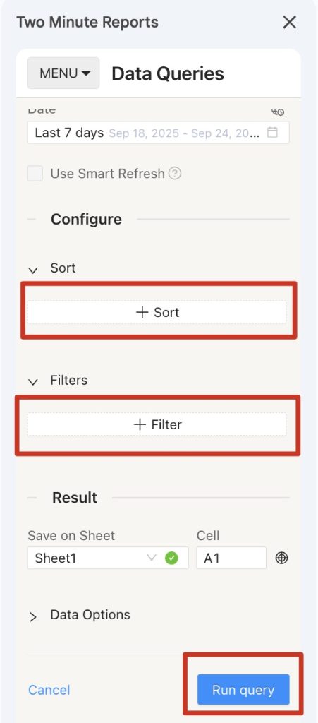 | Pro TMR Tip: Run all your queries directly from the Extensions menu on your Google Sheets. Go to Extensions > Two Minute Reports > choose your desired quick action. |