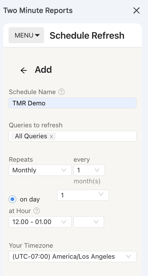 Two Minute Reports’ Schedule Refresh feature has further capabilities. Continue reading about this feature: “How to Refresh Data Automatically in Google Sheets.”