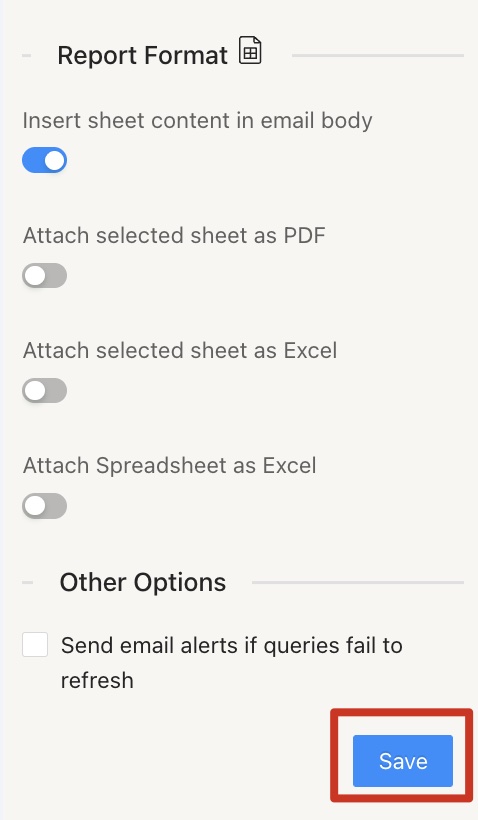You can also choose to specify the reporting format. You can insert the sheet content in the email body, attach the selected sheet as a PDF or Excel, or attach the spreadsheet as an Excel file.