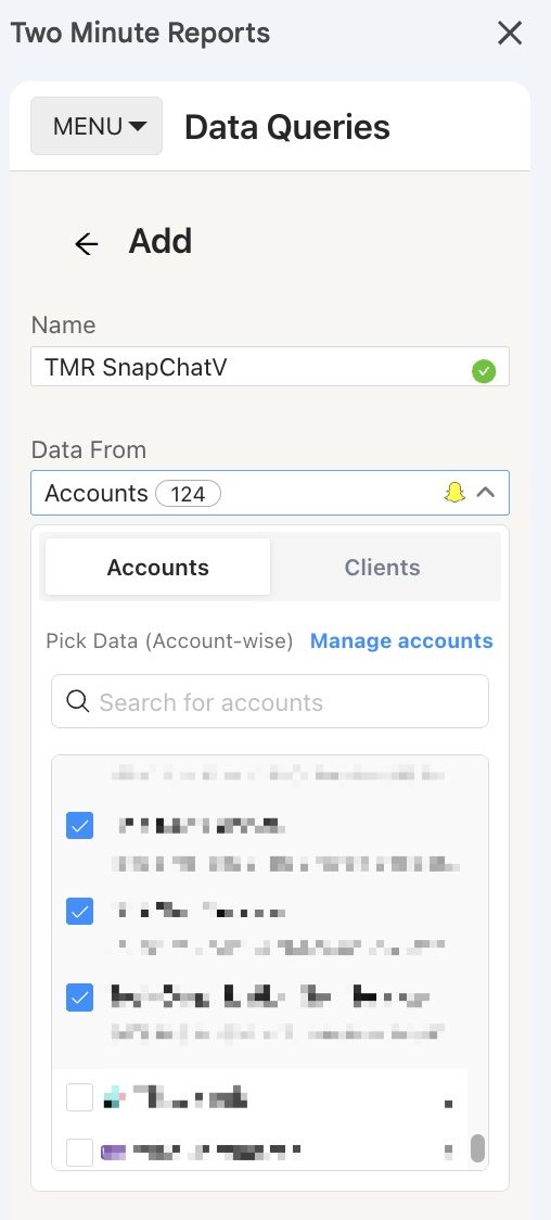 - You can manage multiple clients’ Snapchat Ads accounts under one interface. Simply select one or more accounts to obtain actionable campaign insights.