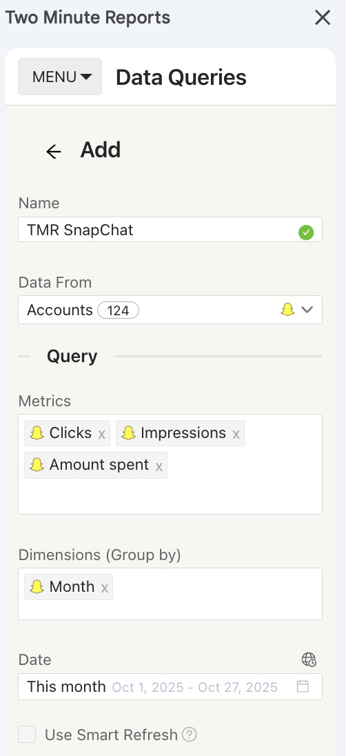 - You must create a new query by navigating to the Data Queries section to extract specific Snapchat Ads campaign data.
