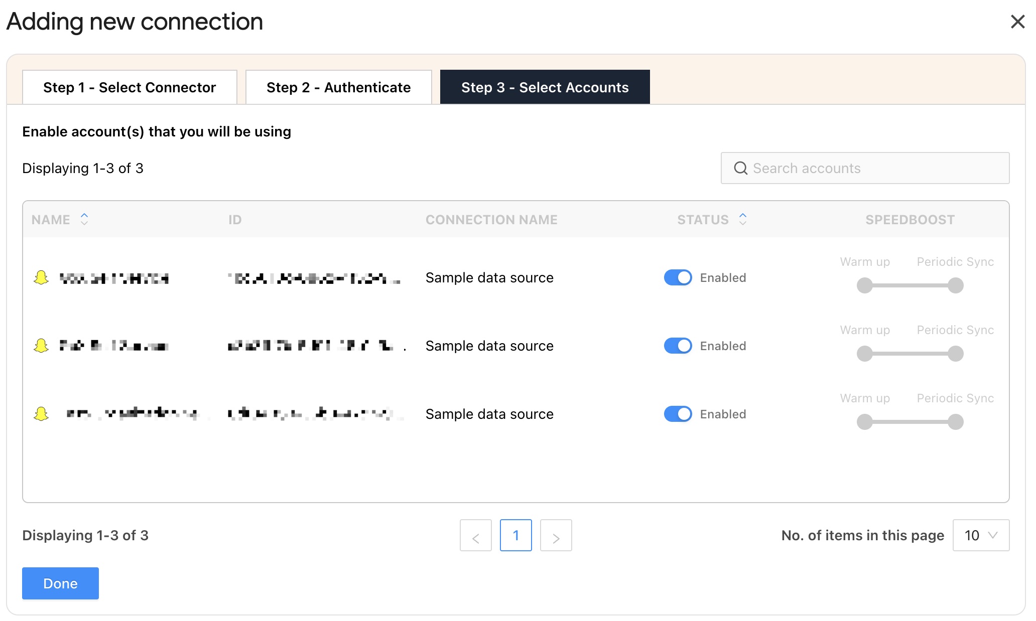 When the “Adding New Connection” dialog box appears, complete the following three key steps to access your Snapchat Ads accounts: