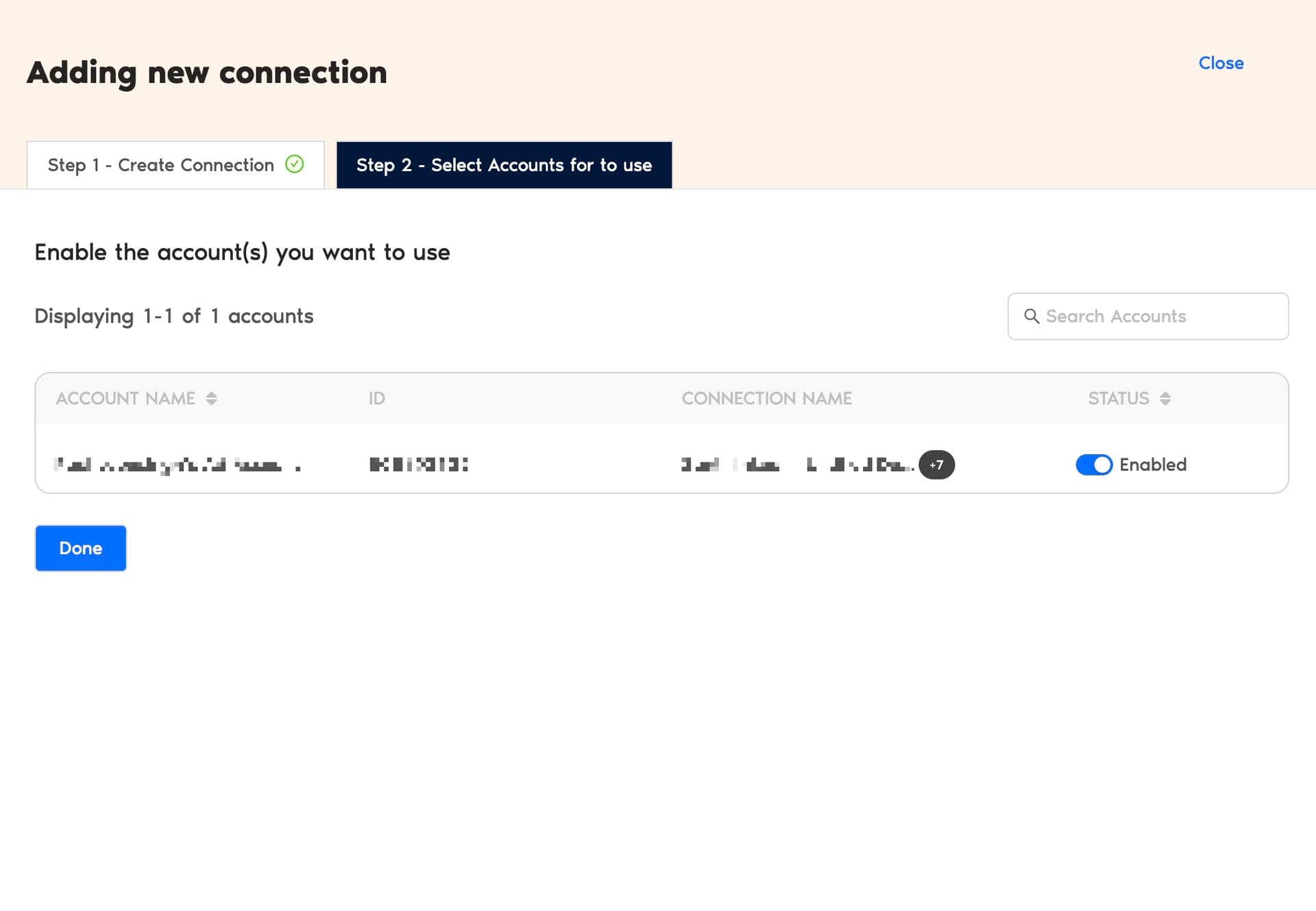 - Once authenticated, you can enable the necessary LinkedIn Ads accounts to analyze campaign performance. Please note that you cannot create reports for disabled accounts.