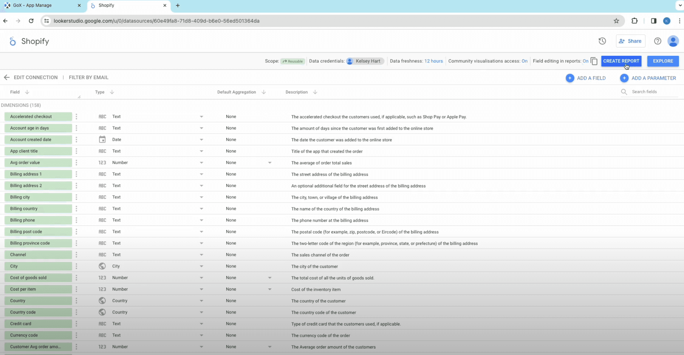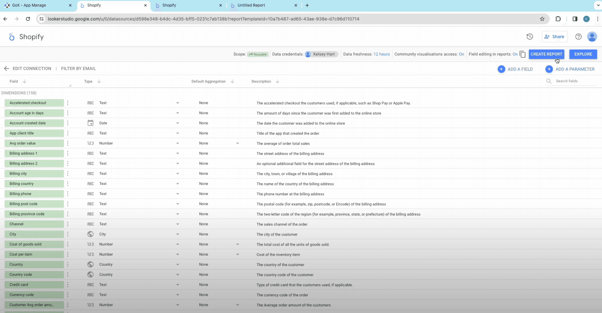 - You will see all the parameters and fields for your Shopify reporting. Eliminate or add fields and parameters as per your need and click on Create Report.