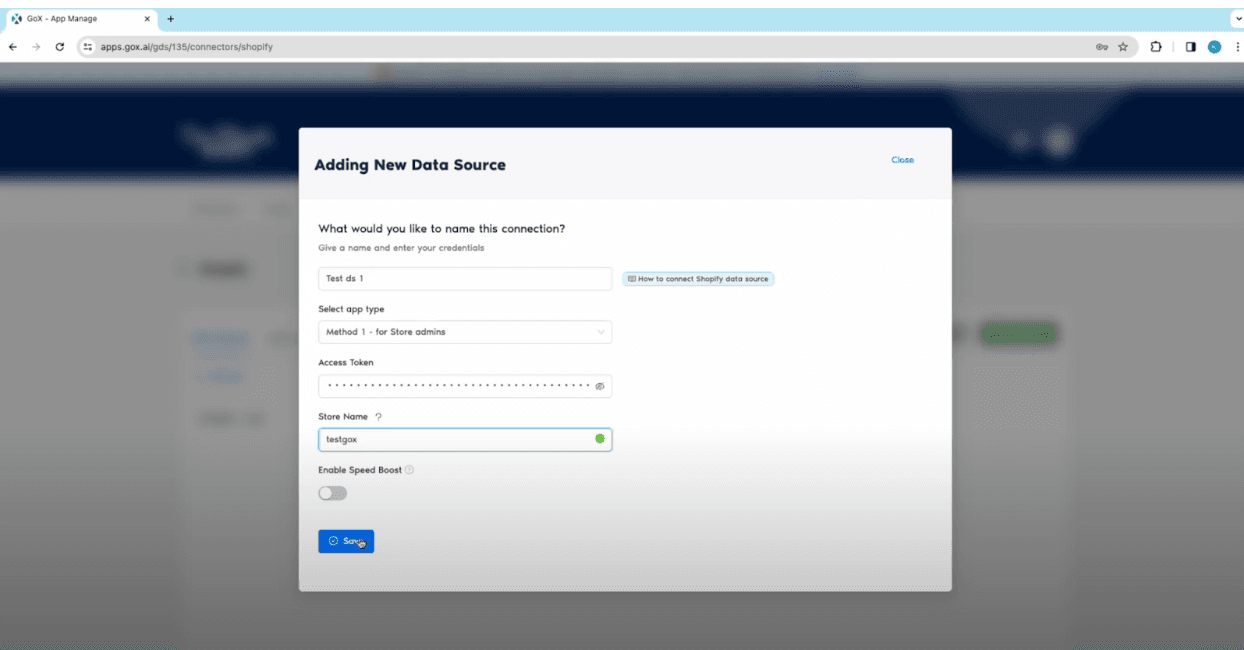 - Fill in the details for connection name, select app type, mention access token, and give the Shopify stores you wish to build a report for. Click here to learn on, How to generate access token. Now click on Save and authorize access.