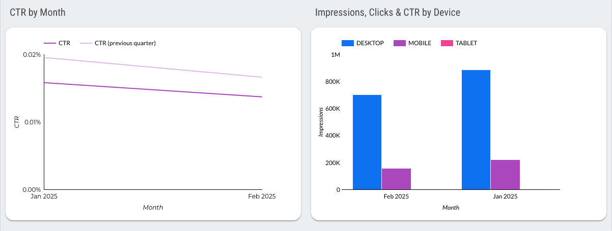 This easy-to-use Google Search Console dashboard template lets you visualise the impact of key metrics such as Impressions, Clicks, and CTR on your website performance. You can customise these metrics as individual scorecards, line charts, and bar charts based on country and device type. The insights obtained will help you enhance the user experience by targeting relevant demographics and optimising for the device type. As an added benefit, you can also showcase comparison tables of impressions, clicks, and CTR metrics based on queries, and pages to uncover your audience’s search intent.