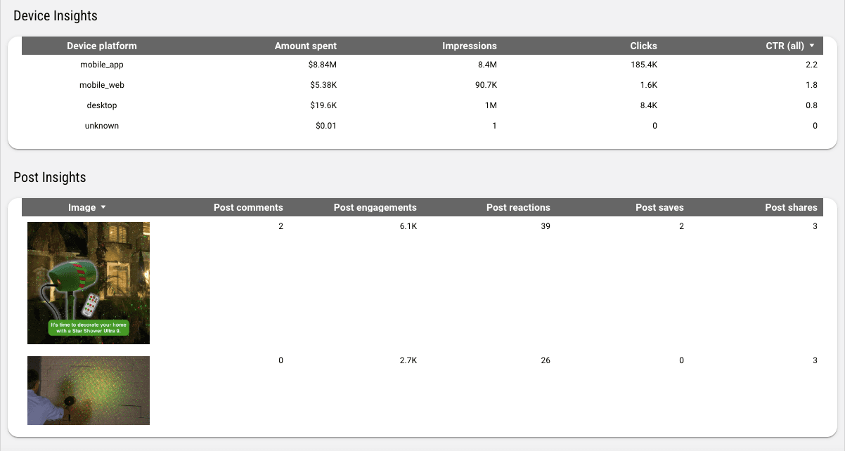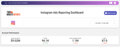 This is a sophisticated Instagram Ads template with a single page that allows you to monitor all of your ad reporting from a single sheet. You can see your account performance, campaign performance, ad performance, audience insights, and post insights. To see an exact representation of the template, click on preview.