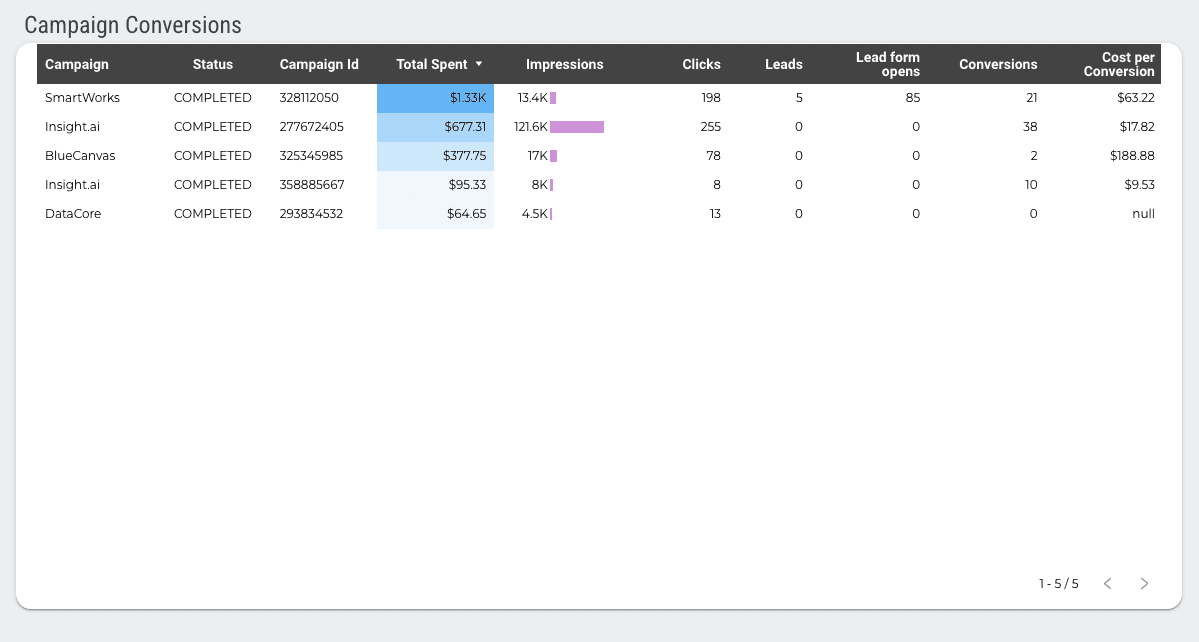 This LinkedIn Ads Reporting Template provides all the necessary KPIs for your LinkedIn campaigns in a single report. Our template includes scorecards for Impressions, Clicks, Post View Conversions, Leads, Total Spent and Conversions. Additionally, there is a dedicated table for campaign insights, a performance indicator table with metrics such as CPC and CTR, a campaign delivery table showcasing Serving Location, Leads, and Cost per Lead, a campaign engagement table displaying Comments, Shares, and Follows, and finally, the campaign conversions table presenting Conversions and Lead Form Opens. Overall, this template serves as a one-stop solution for your LinkedIn ad analytics.