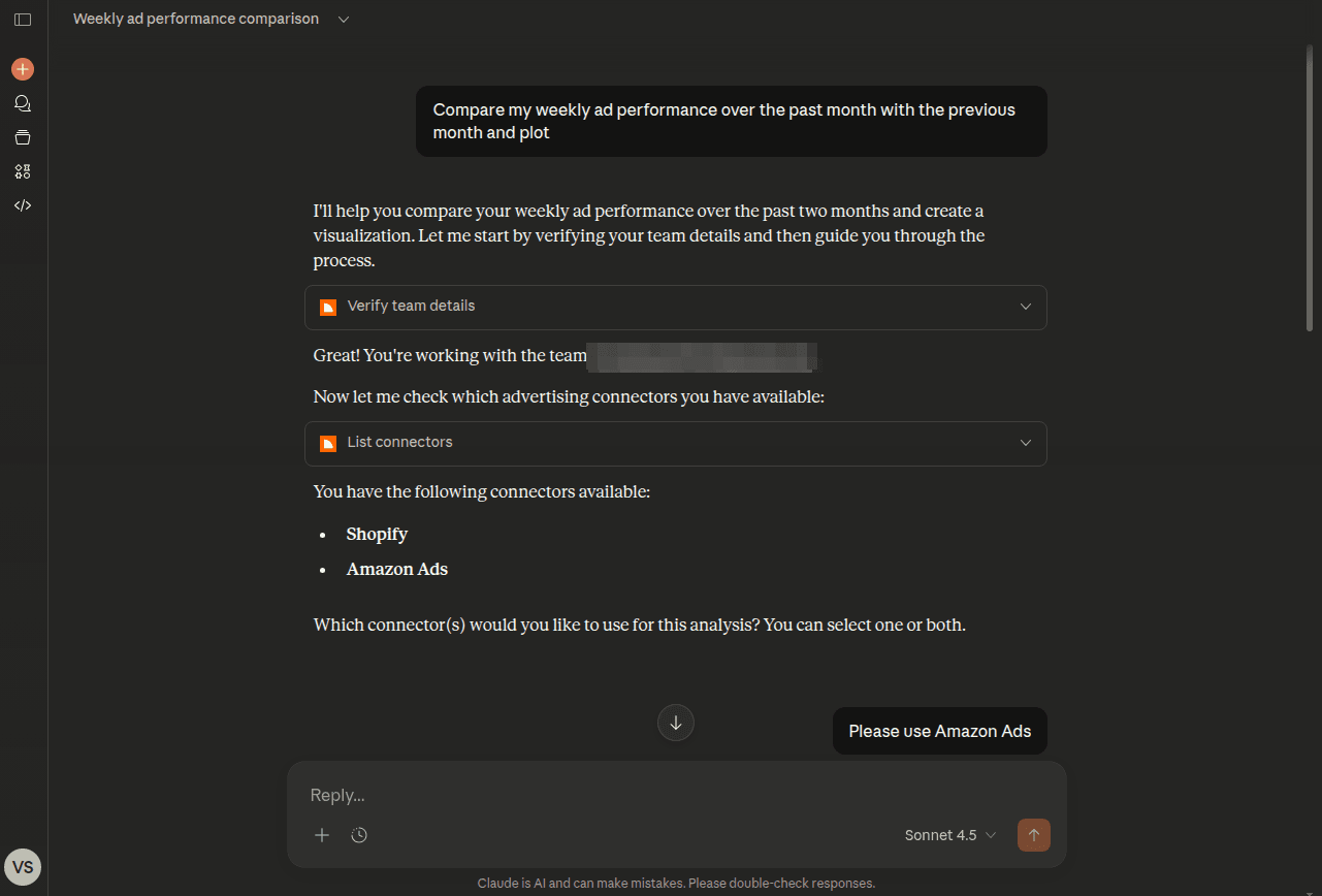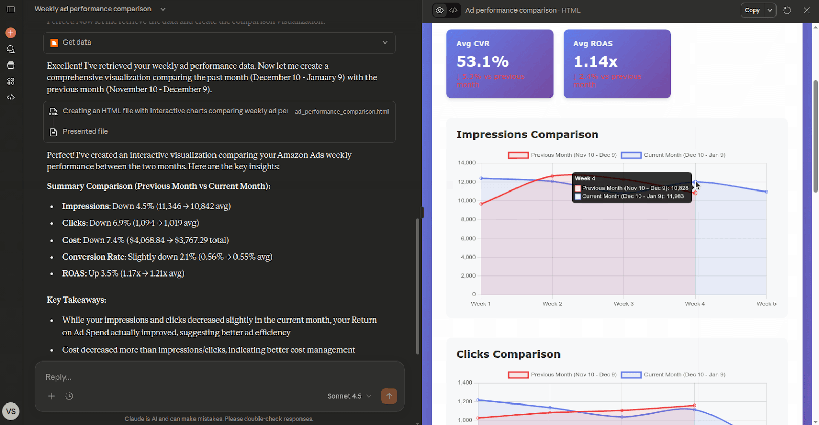 Prompt: “Compare my weekly ad performance for the past month with the previous month and plot the results.”
