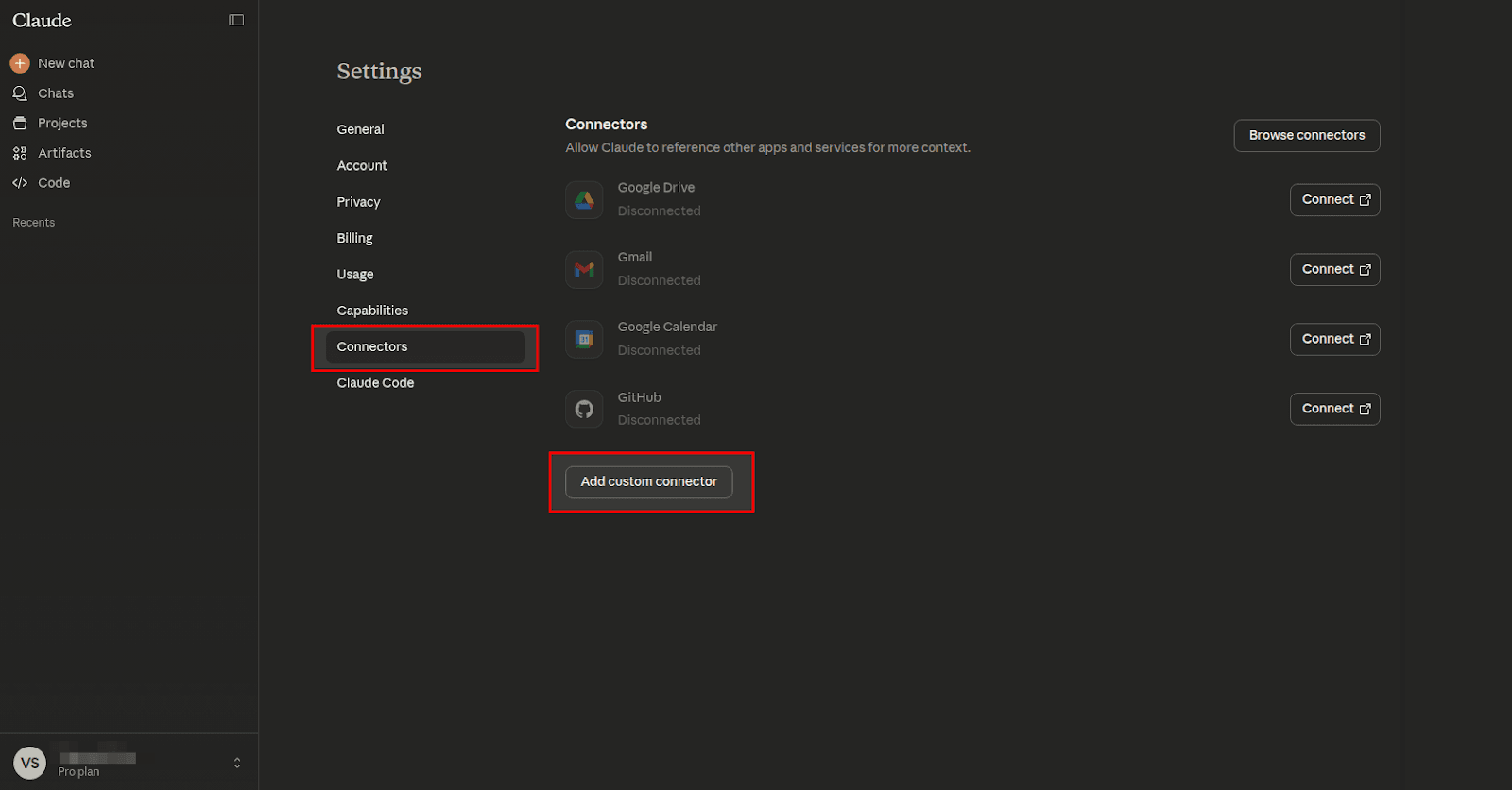 3. Go to Connectors and click Add custom connector at the bottom.
