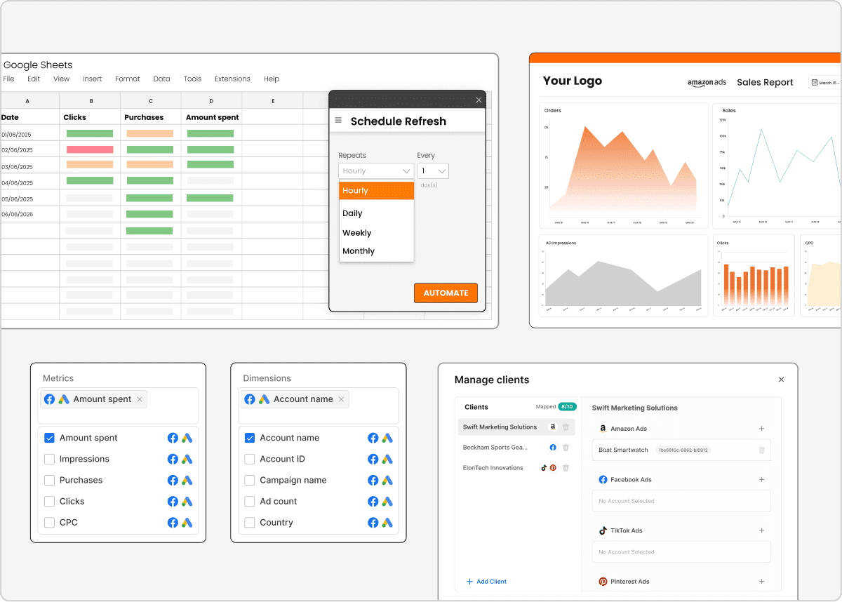 Get unlimited insights from your Amazon Ads data inside Google Sheetsโข โ automate reports, blend metrics, and monitor performance like a hawk.
